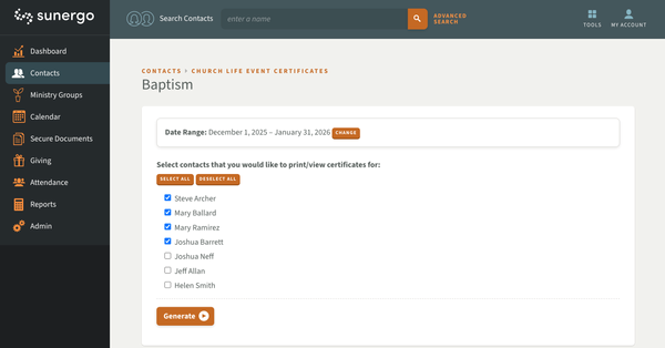 - Select the checkbox for the contacts you would like to view or print certificates for, then select Generate.