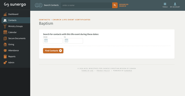 - Open Sunergo Church and go to Contacts > Life Event Certificates.